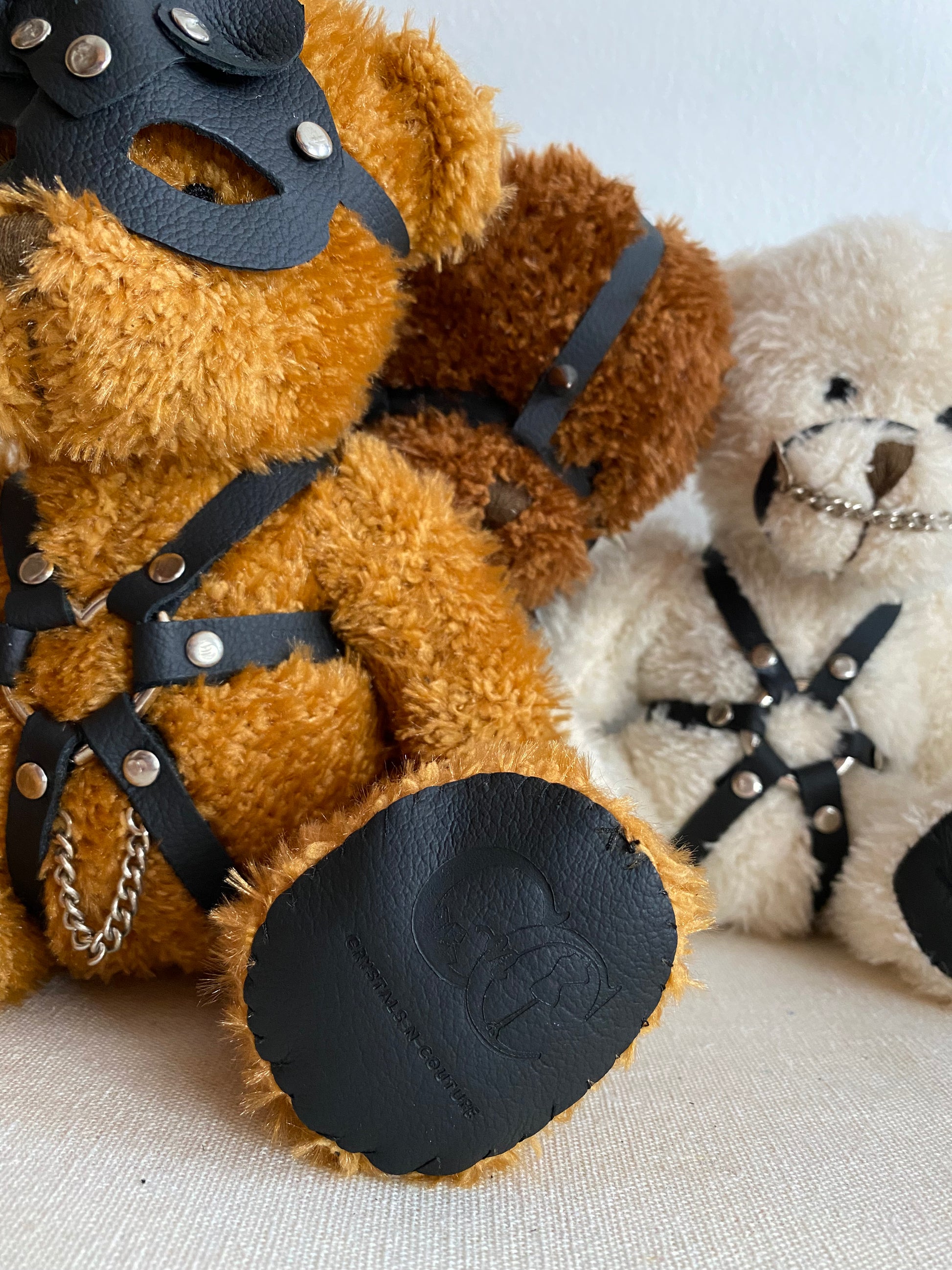 The bear is mass-produced, while the harness, branding and mask are hand crafted with love from genuine leather.