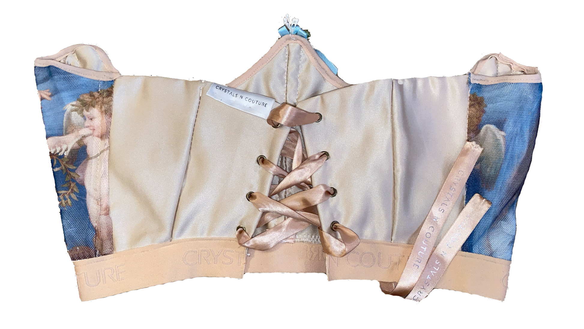 Exclusive handmade, satin couture under bust corset, featuring a romantic renaissance print.