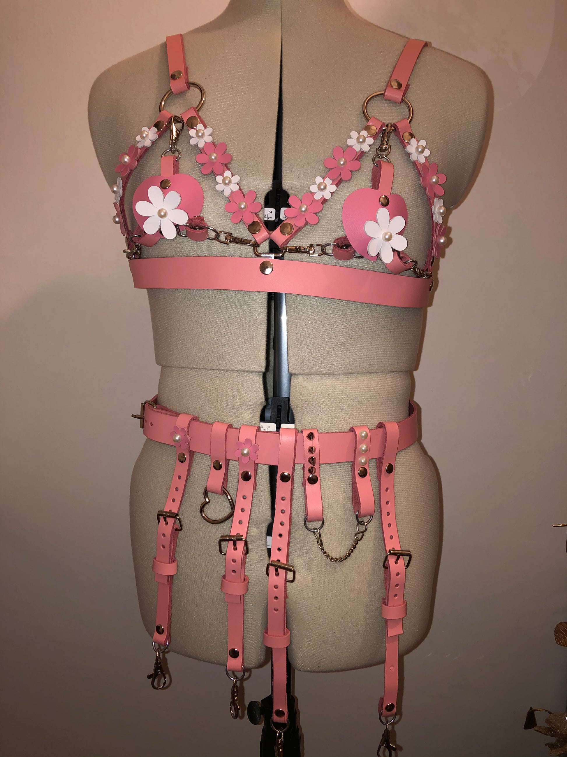 Pink & white pearl blossom handmade genuine leather cage harness bra, also available to shop in a selection of colours.